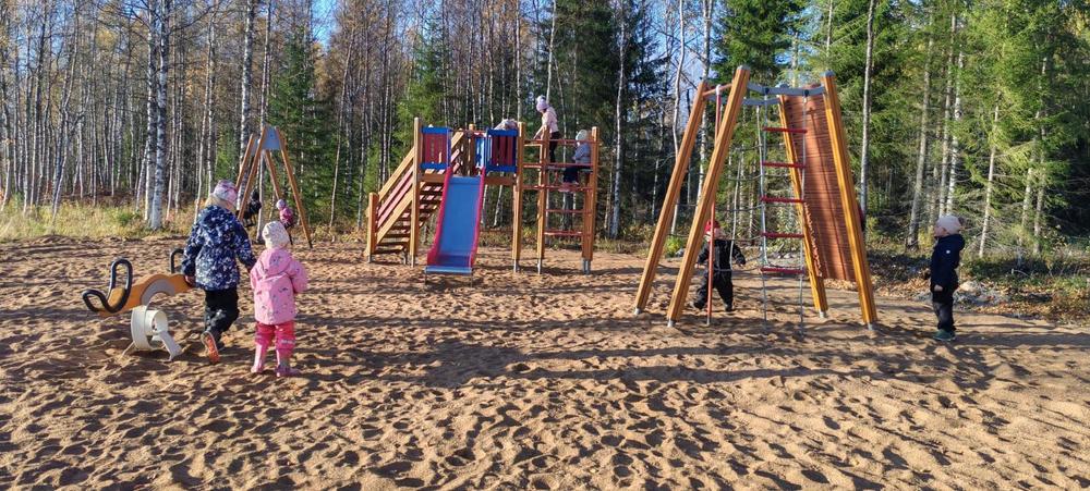 Leikkialueen rakentaminen aloitettiin raivaamalla sopivan kokoinen alue, laitteiden turvaetäisyydet huomioiden, leikkivälineille. Tarvittavat pohjatyöt, kantojen ja kivien poisto sekä tasaus, tehtiin konetyönä kaivurilla. Leikkialueen alustaksi tuli paksu patja hienojakoista hiekkaa, jonka tarkoituksena on toimia pehmeänä laskeutumisalustana ja vähentää loukkaantumisriskiä. Rikkakasvien esteeksi asennettiin suodatinkangas. Kesän 2025 aikana asennettiin leikkipaikalle Simon kunnan Kantolanharjun leikkipuistosta vapautunut Lappset leikkivälineistö. Talven 2024 - 2025 aikana kaikki leikkivälineet purettiin, tarkastettiin, kunnostettiin ja maalattiin uudelleen alkuperäisten värimallien mukaisesti.